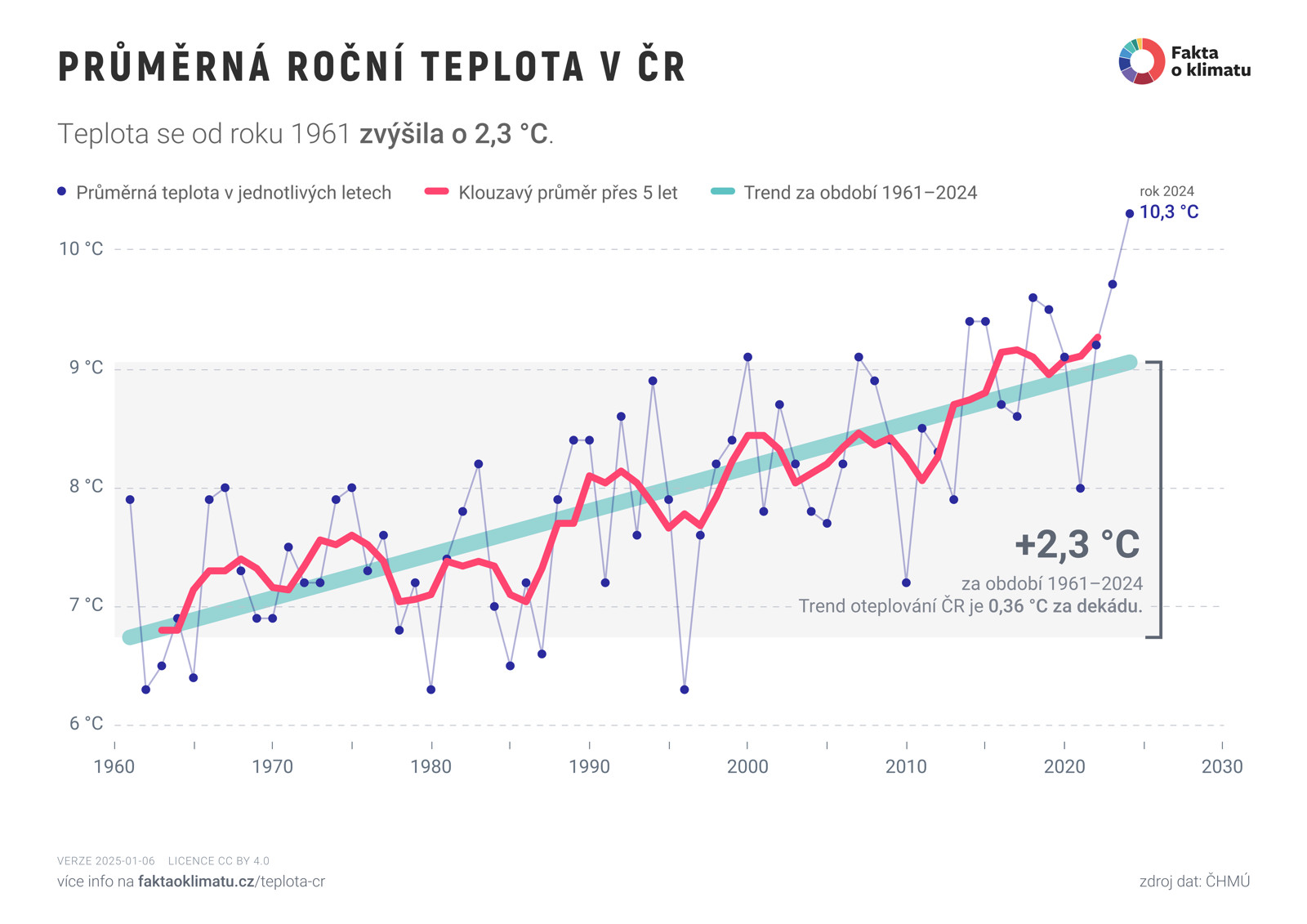 Zatímco se celá planeta od předindustriální doby oteplila přibližně o 1,2 °C, Česká republika je na tom výrazně hůře (2,3 °C). Grafy vývoje těchto teplot si můžete prohlédnout níže v textu. Tento rozdíl není náhoda, ani chyba měření. Je to daň za naši kontinentální polohu a důsledek globálního systému.