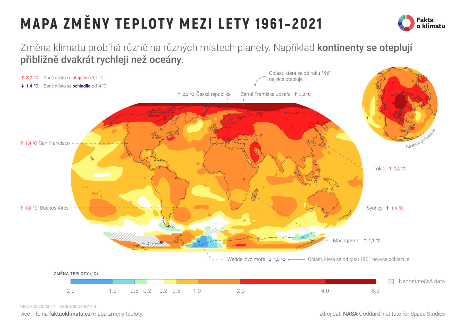 Mapa změny teploty mezi lety 1961–2021 od autora Fakta o klimatu, licencovaný pod CC BY 4.0.
