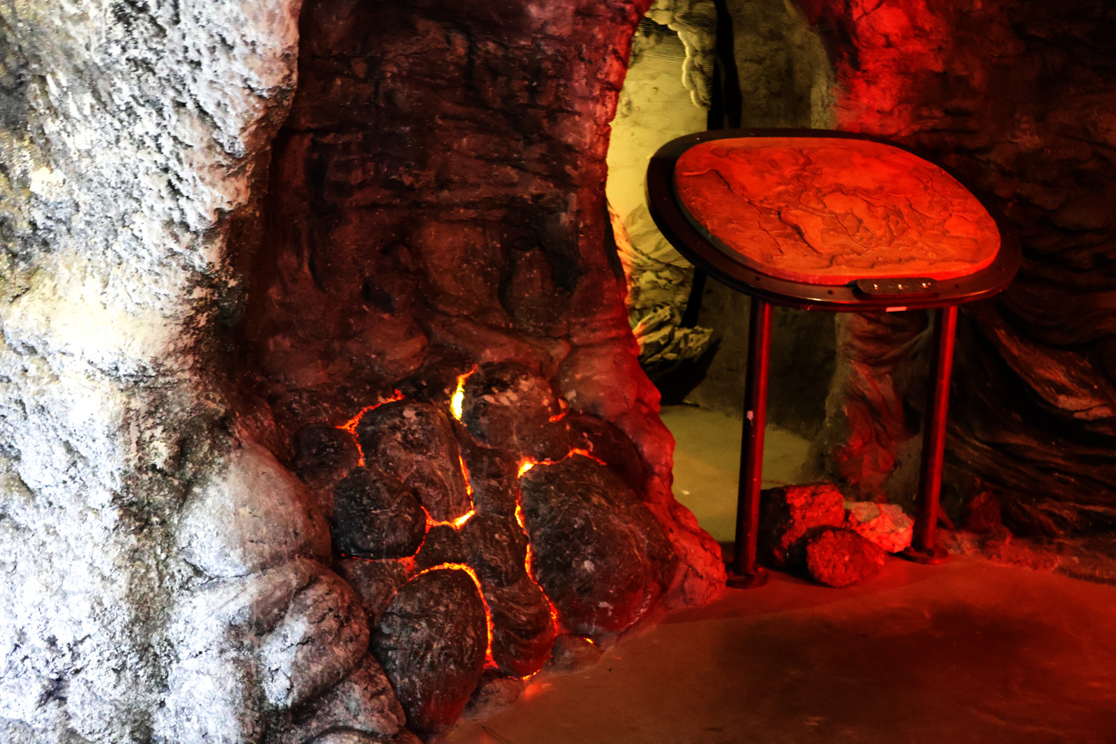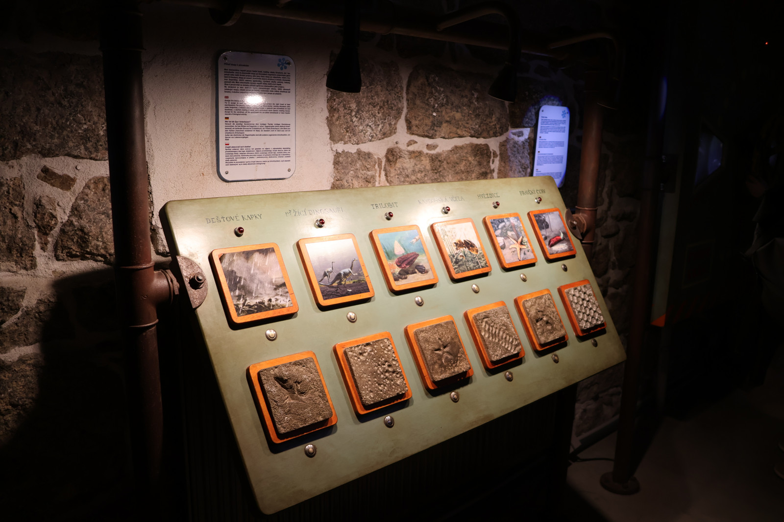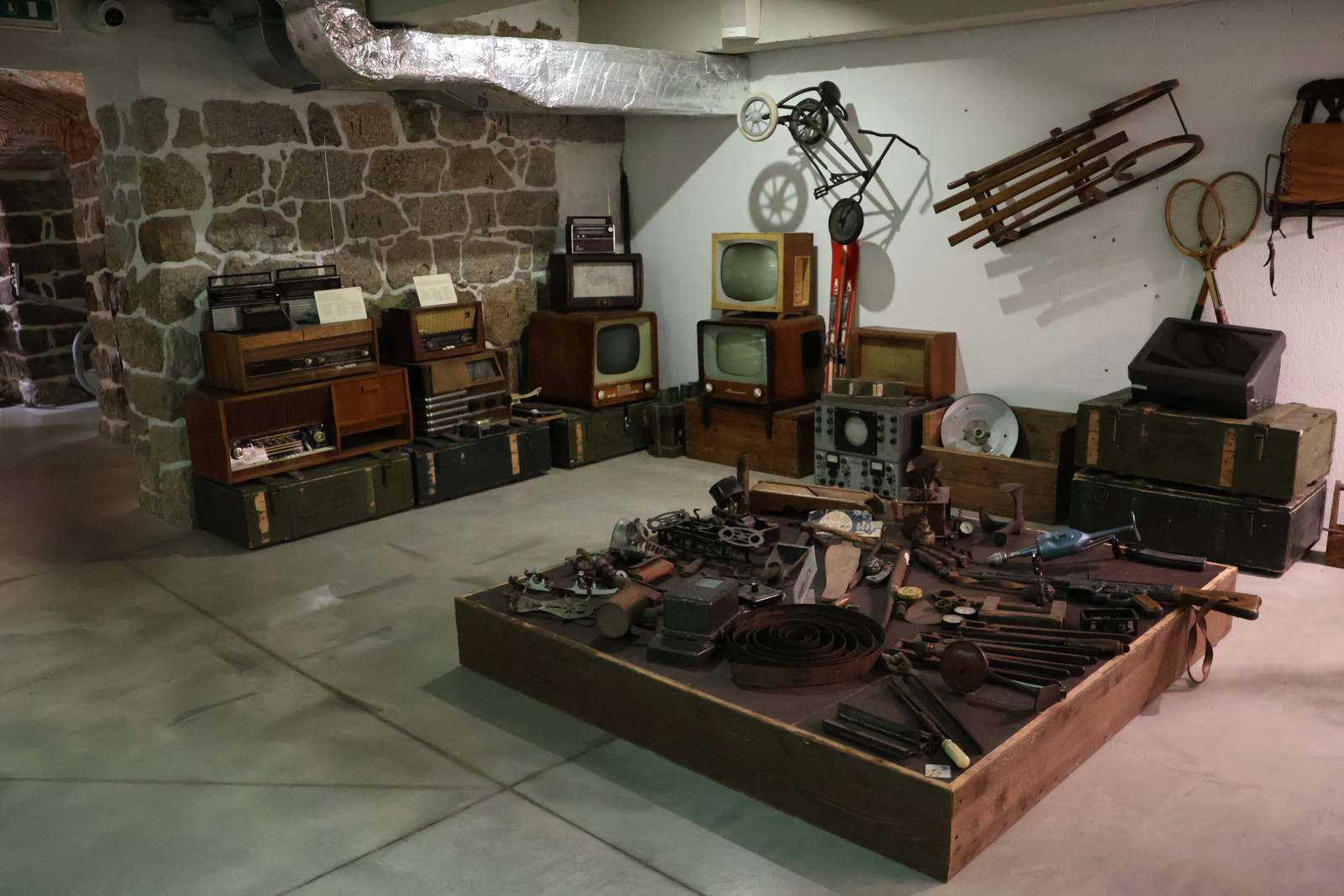 V podzemním prostoru jsou přiznané cihly, které evokují minulost. Především té se týkají obě expozice, které tu jsou.