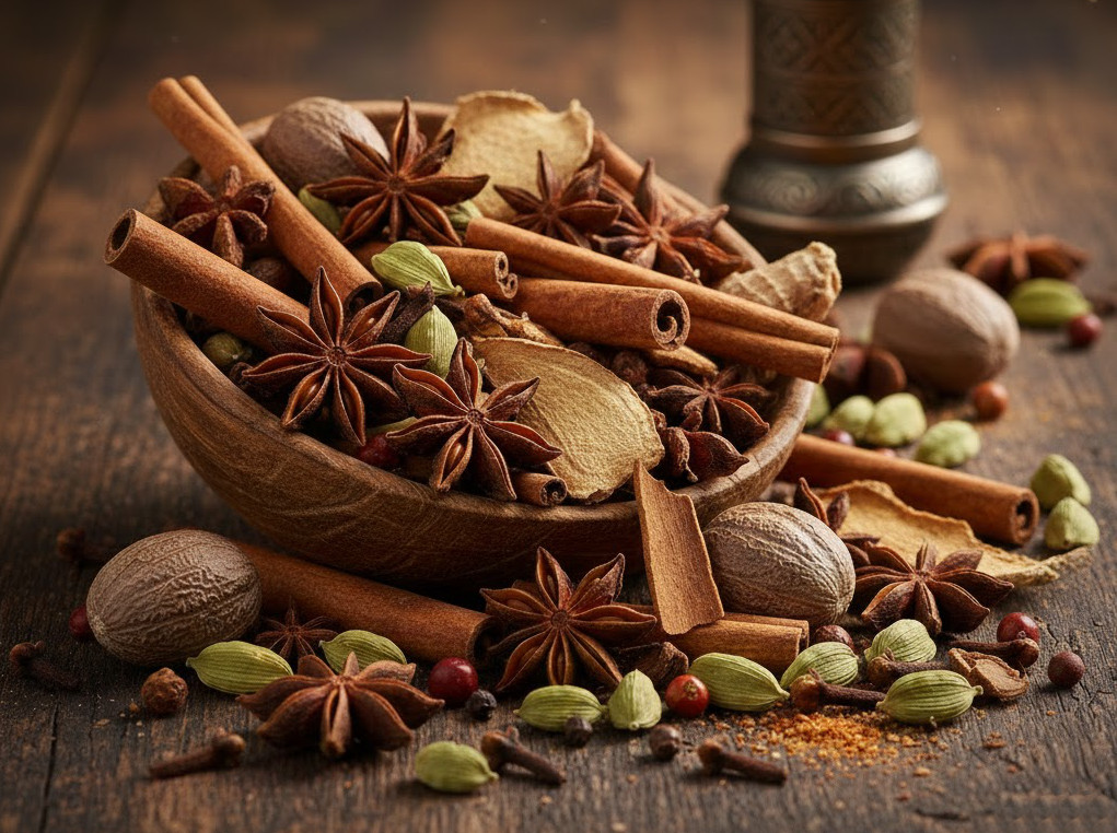 Kardamom (Elettaria cardamomum) je považován za jedno z nejušlechtilejších koření. Používáme semena, která se ukrývají v drobných luscích. Kardamom vnáší do směsi luxusní, květinové a citrusové tóny, které zabraňují tomu, aby byla výsledná chuť příliš těžká a zemitá. Nové koření (Pimenta dioica) má unikátní původ – pochází z bobulí tropického stromu. Anglický název „Allspice“ (vše-koření) přesně vystihuje jeho chuť, která připomíná kombinaci hřebíčku, skořice a muškátového ořechu. Tvoří skvělý chuťový můstek, který propojuje všechny ostatní silné komponenty.