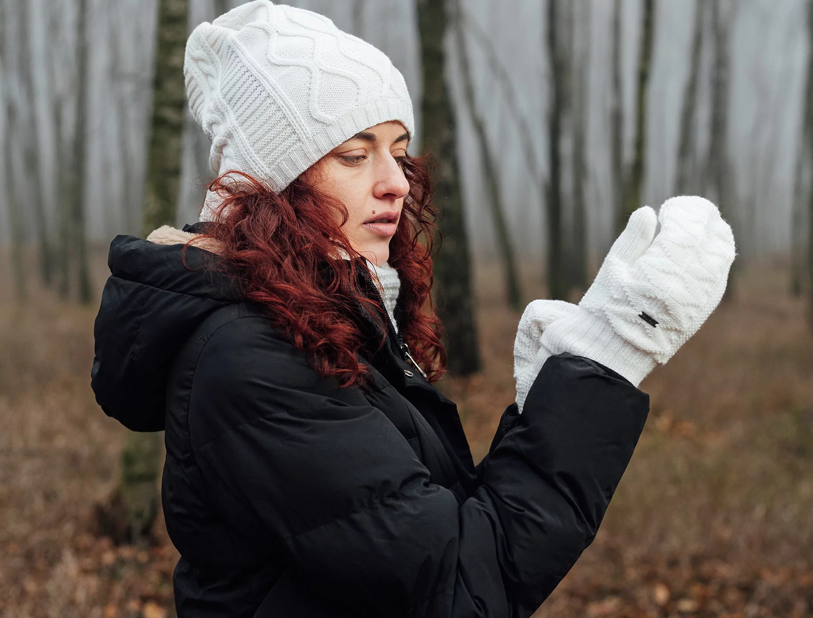Nejvíc tepla utíká hlavou a nejrychleji mrznou prsty. Pokud vám umrznou nohy, končíte. Abyste měly nohy v teple, hledejte ponožky s co nejvyšším obsahem přírodní vlny. Vyrábí je pomerně dost českých výrobců. Na ruce Volte palčáky, kde mají prsty víc místa a tak rychle nepromrznou. Volte rukavice s nepromokavou vrchní vrstvou. Pro ještě větší zateplení pod palčáky můžete vzít prstové vlněné rukavice. Vlna vás hřeje a svrchní vrstva zajistí, že i kdyby padaly trakaře, vaše ruce budou v suchu a teple. Čepička s vlněnými palčáky v setu, jako na fotce, je sice efektní, ale pro náš případ se úplně nehodí. :-). Čepici ovšem nepodceňujte. Jak jsem psala, hlavou odchází nejvíc tepla.