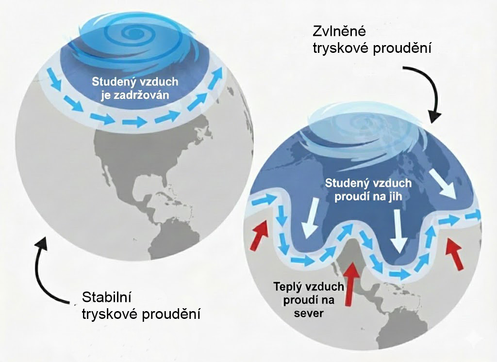 Pokud ale zeslábne, začne meandrovat – podobně jako líně tekoucí řeka v nížině. A právě tyto obří vlny (tzv. Rossbyho vlny) jsou klíčem k extrémům, které zažíváme.Nejen mráz, ale i vlny tepla
