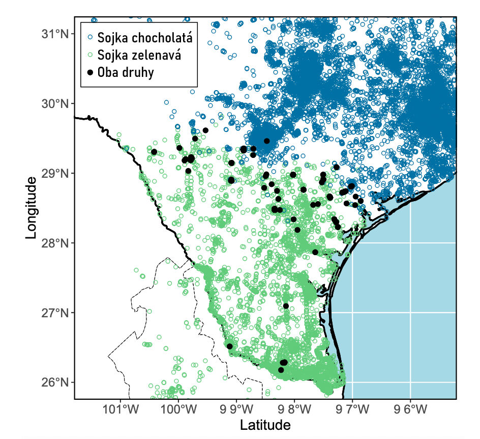zobrazit detail snímku: Výskyt sojky chocholaté a zelenavé v USA v letech 2000 až 2023.